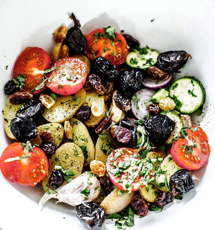 • Déposez les morceaux de poulet dans un plat allant au four. Ajoutez les oignons, l’ail et le céleri grossièrement hachés, les raisins, les pruneaux égouttés, les courgettes coupée en petits dés, les pommes de terre coupées en quartier.